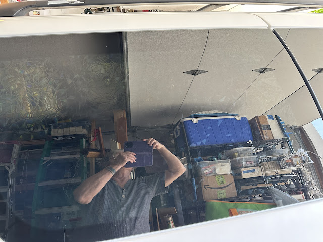When I'm driving, my camp chair is bungied here but it moves out when I'm parked, and it will probably ride in the car top carrier once I get it put on. To the left you'll see a green spray bottle. That has water in it for putting up my window film. You'll also see my "luggable loo" toilet under that white top. I store the bags for the loo inside. I just bought that rainbow colored netting - not sure if I"ll use it or not. Up top you'll see my two solar lamps.